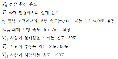 - 여기에서 v_0은 정상 조건에서의 이동 속도, v_t는 화재 영향 하에서의 등가(유효) 대피 속도를 의미한다.