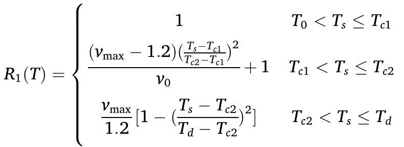 - Milke(2000)가 제안한 관계식에 따라, 온도가 대피 속도에 미치는 영향 함수 R1(T)는 다음과 같이 정의된다.