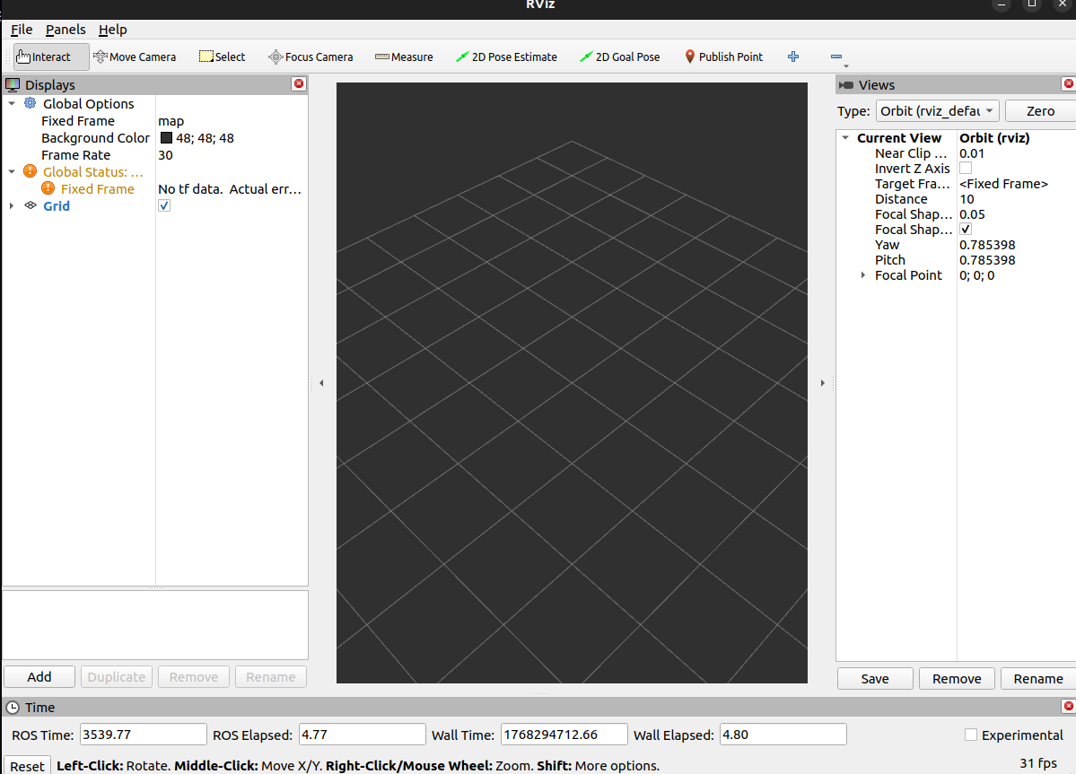 Take note of the ROS Time and ROS Elapsed times listed in the bottom of the RViz window. These are currently displaying the wall time and, typically, match the Wall Time and Wall Elapsed fields.