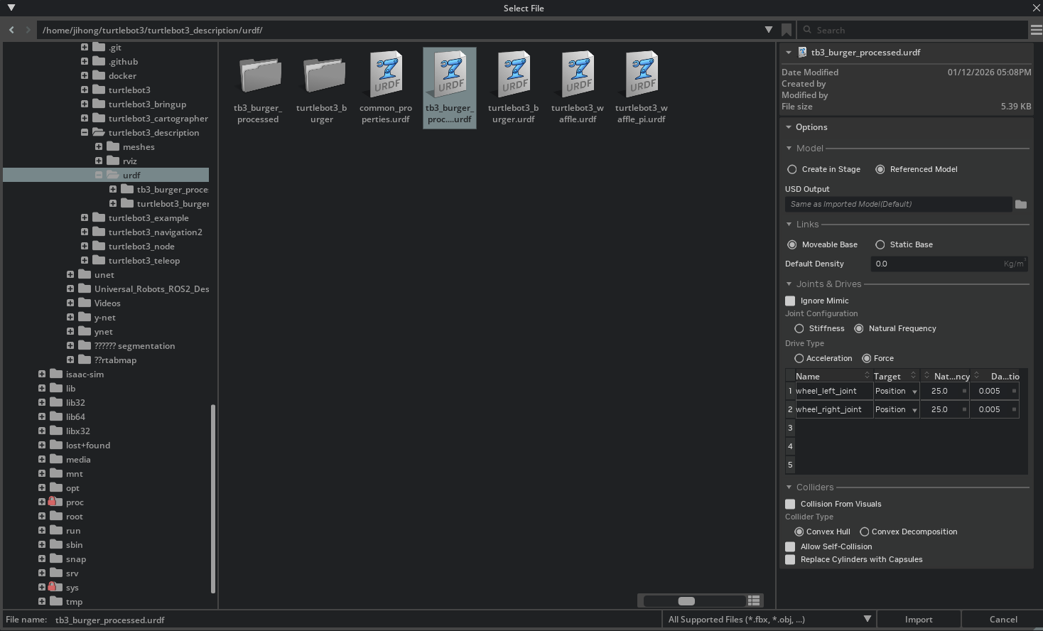 file --> import에서 tb3_burger_processed.urdf를 선택