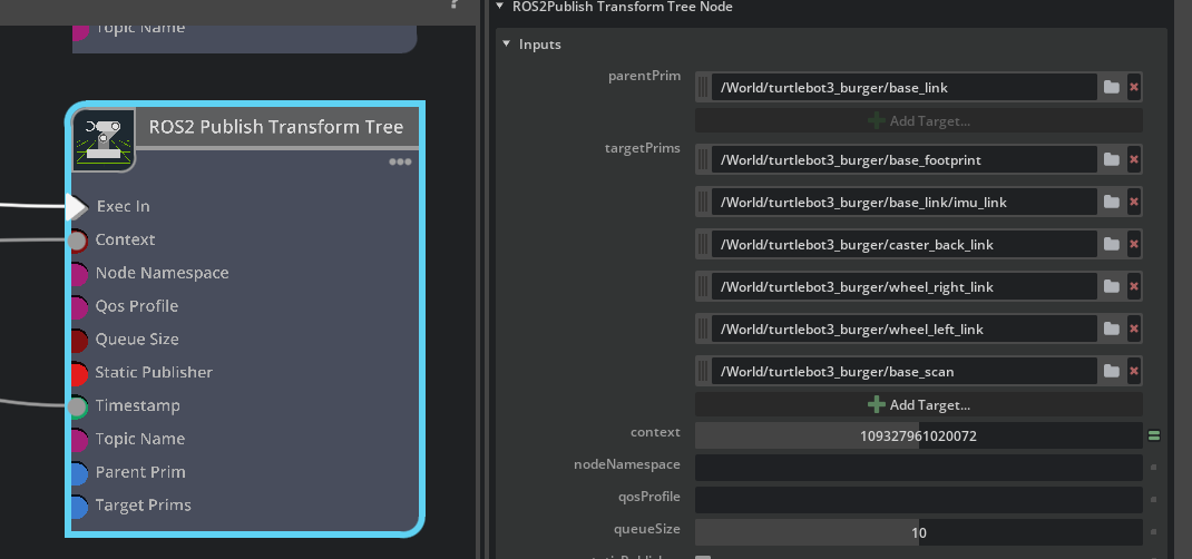 이를 위해서 그래프에 ROS2 publish Transform Tree노드를 하나 더 추가하고, 앞의 노드들과 동일하게 Exec In , context , timestamp를 연결한다.- Ros2 publish transform tree노드의 property 탭