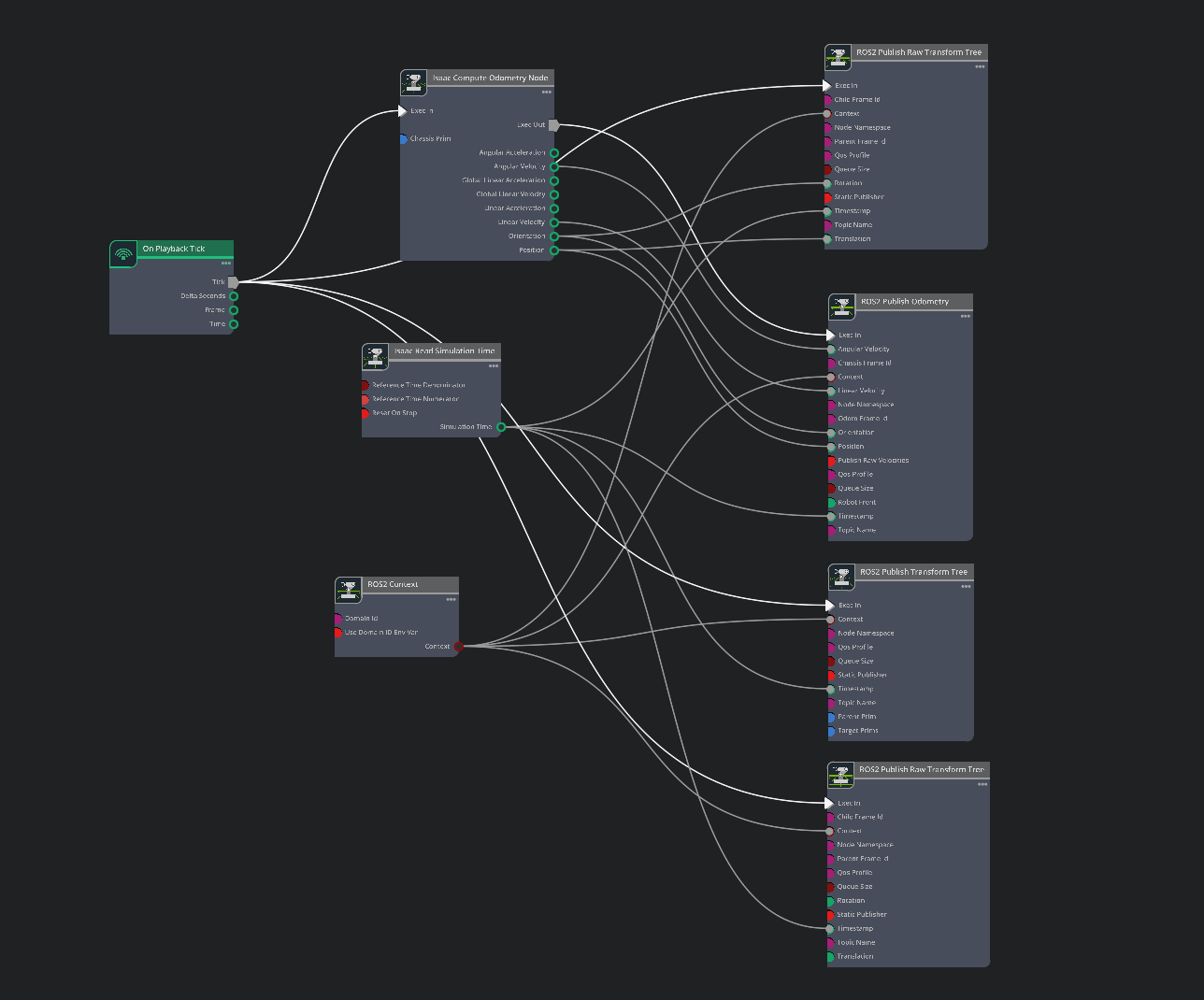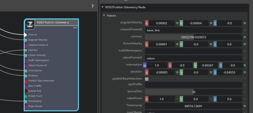 To setup odometry for a robot, publish the odometry ROS message and its corresponding transforms. Note The ROS2 Publish Odometry node publishes full 3D velocity information. Both linear velocity and angular velocity are published with all three dimensions