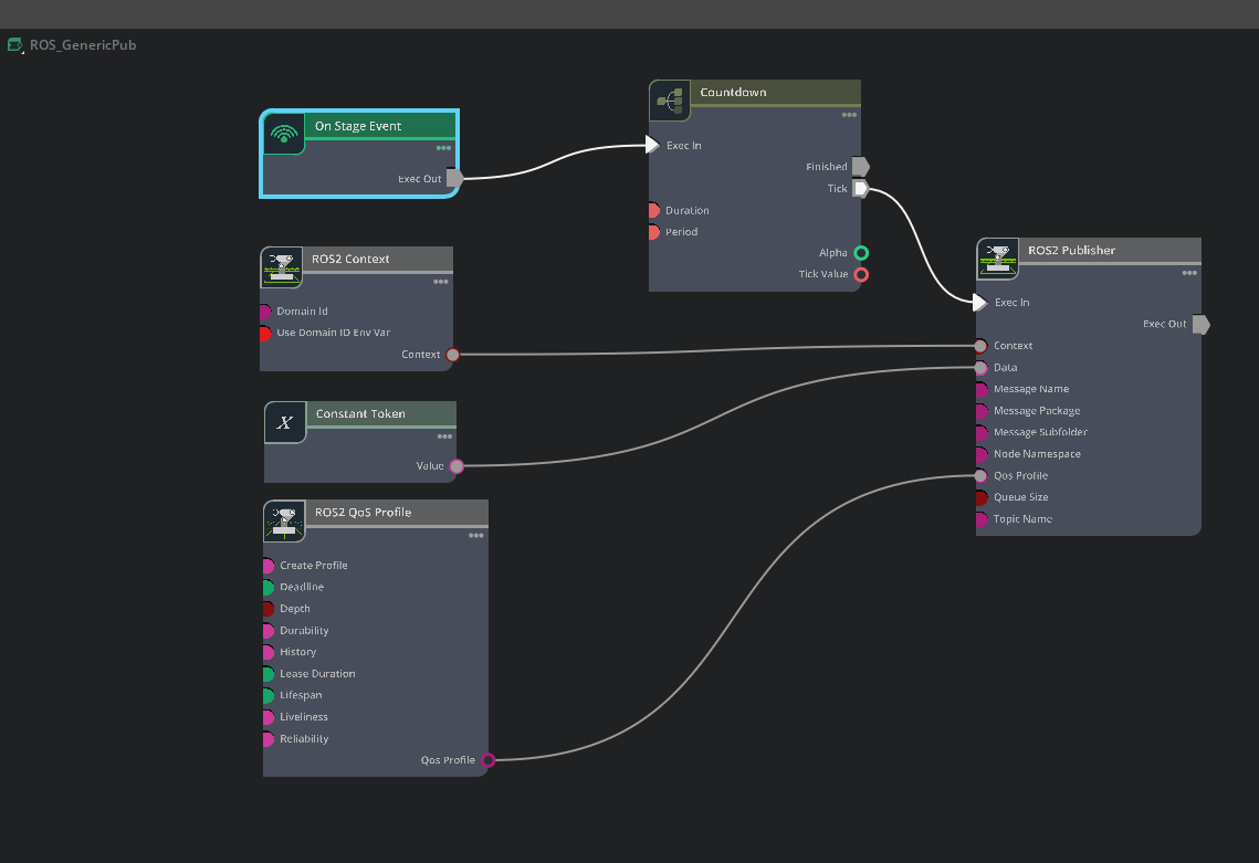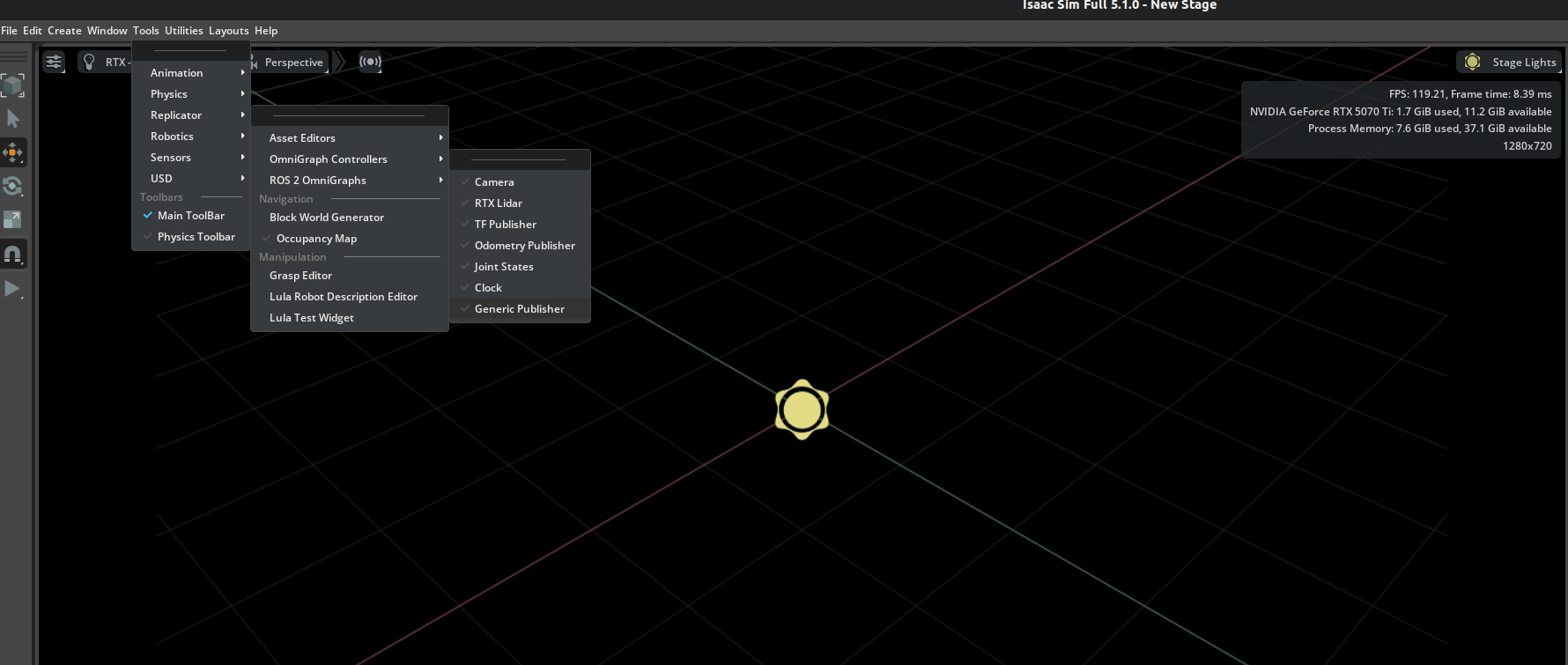 1. Tools > Robotics > ROS 2 OmniGraphs > Generic Publisher를 선택한다.