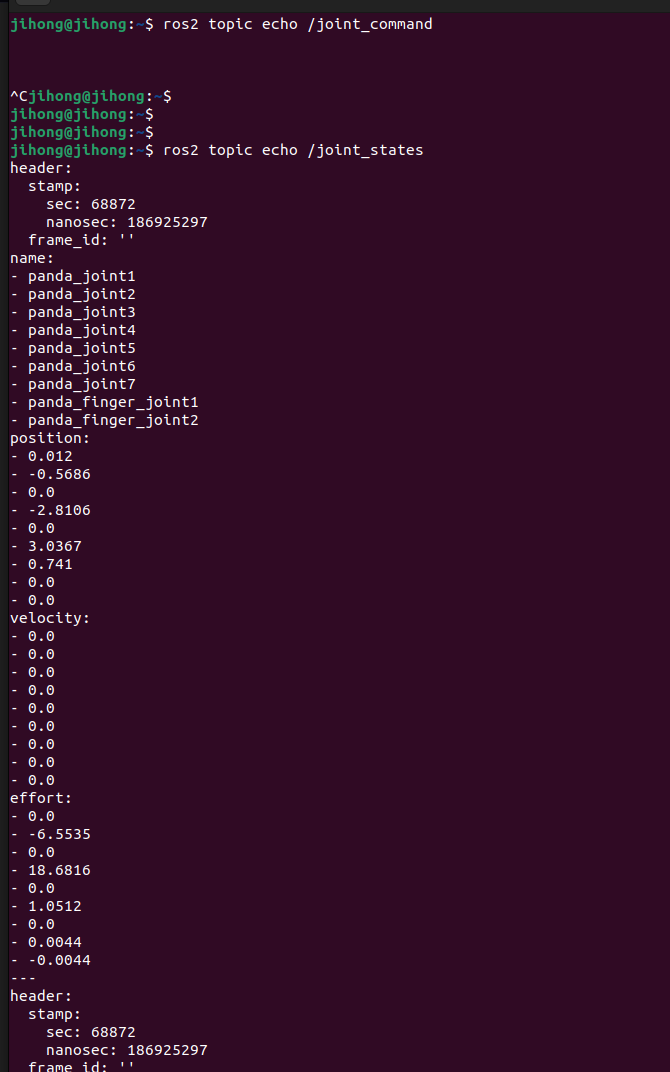 - ros2 subscribe joint state : /joint_command 토픽에서 ros2 joint state를 subscribe한다.