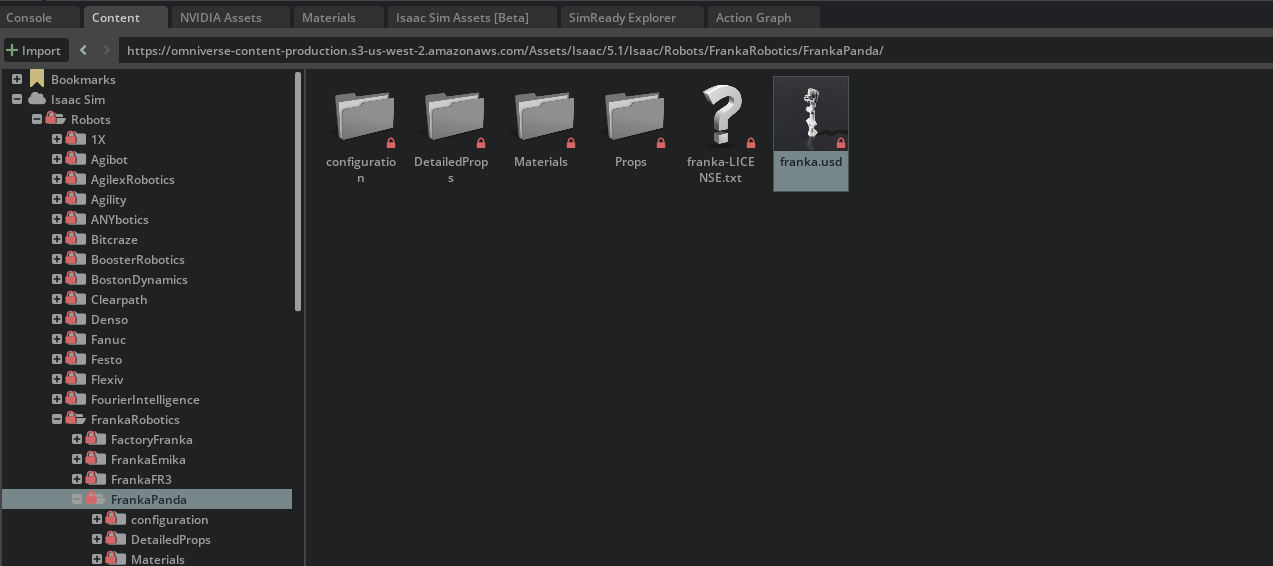 1. saac Sim > Robots > FrankaRobotics > FrankaPanda > franka.usd을 불러온다.
