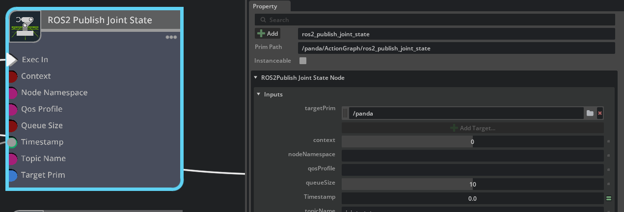 3. ROS2 publish joint state노드들 선택한다. 그리고 아래처럼 target prim에 /panda를 추가한다.
