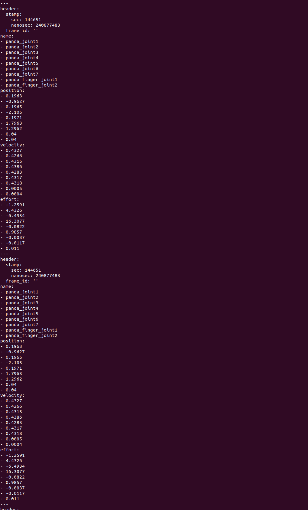 6. ros2 run isaac_tutorials ros2_publisher.py을 하면 로봇이 움직일거임. 그때 ros2 topic echo /joint_states로 확인해본다.