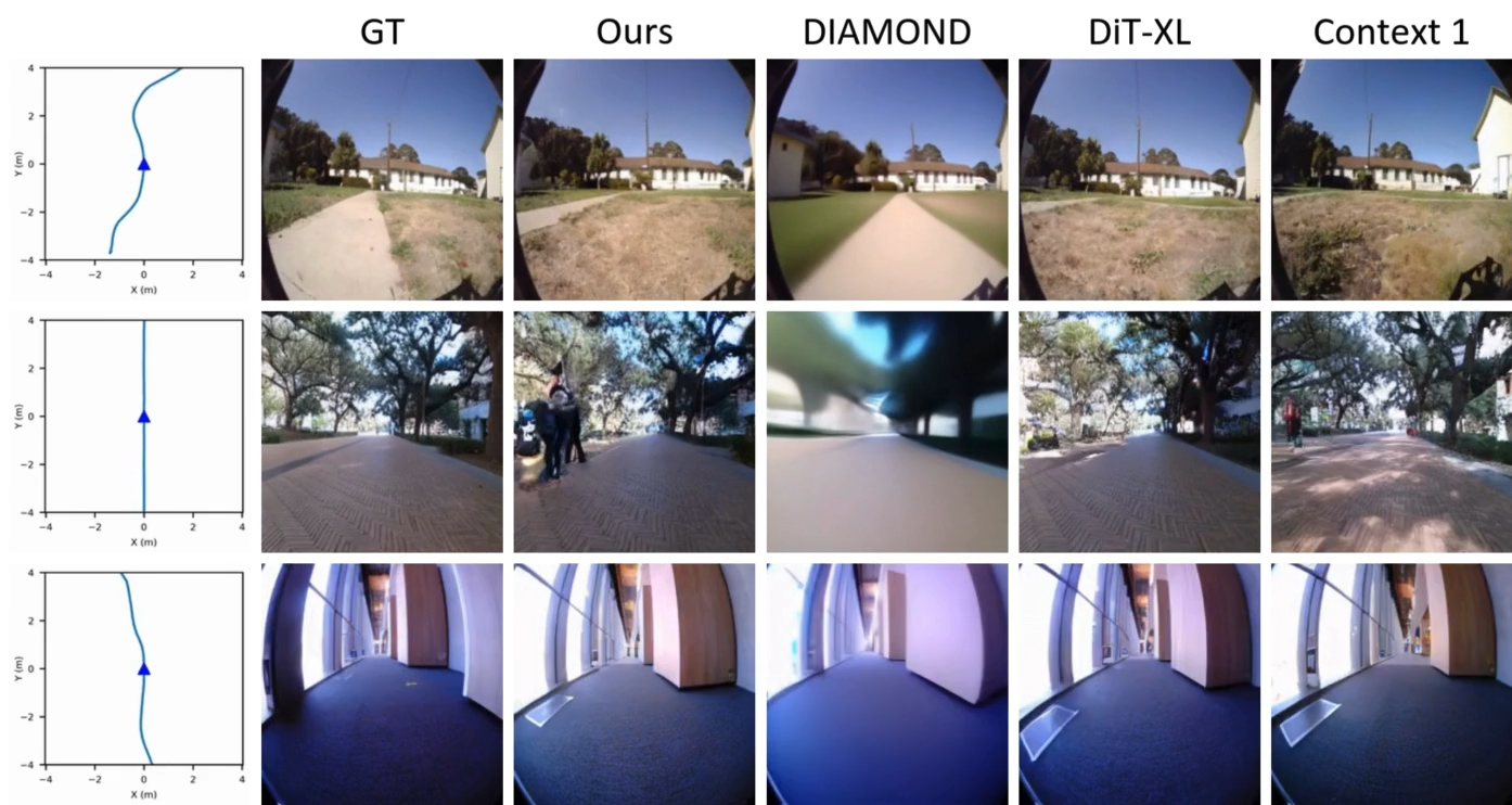 https://openaccess.thecvf.com/content/CVPR2025/papers/Bar_Navigation_World_Models_CVPR_2025_paper.pdf visual-motor capabiltiesvisual정보를 활용하여 motor(움직임/조작)을 만들어내는 능력visual : stero iamge , depth , optical flow ...motor : 로봇의 바퀴 각도 , 속도 등즉, "보면서 움직이는"능력ex) 로봇이 카메라로 복도를 보고 장애물을 피해서 이동, 드론이 영상 보며 착륙 지점으로 접근 등 controllable video generation model비디오를 생성/예측하는 모델인데, 사용자가 주는 컨트롤 신호(조건) 에 따라 결과가 달라지는 모델임..