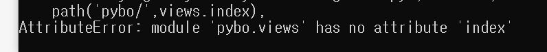 맵핑후에 다시 로컬/파이보에 접속하며 cmd에 다음과 같은 오류가 출력되며 이유는 URL맵핑하면서 추가한 views.index가 없기 때문이다.