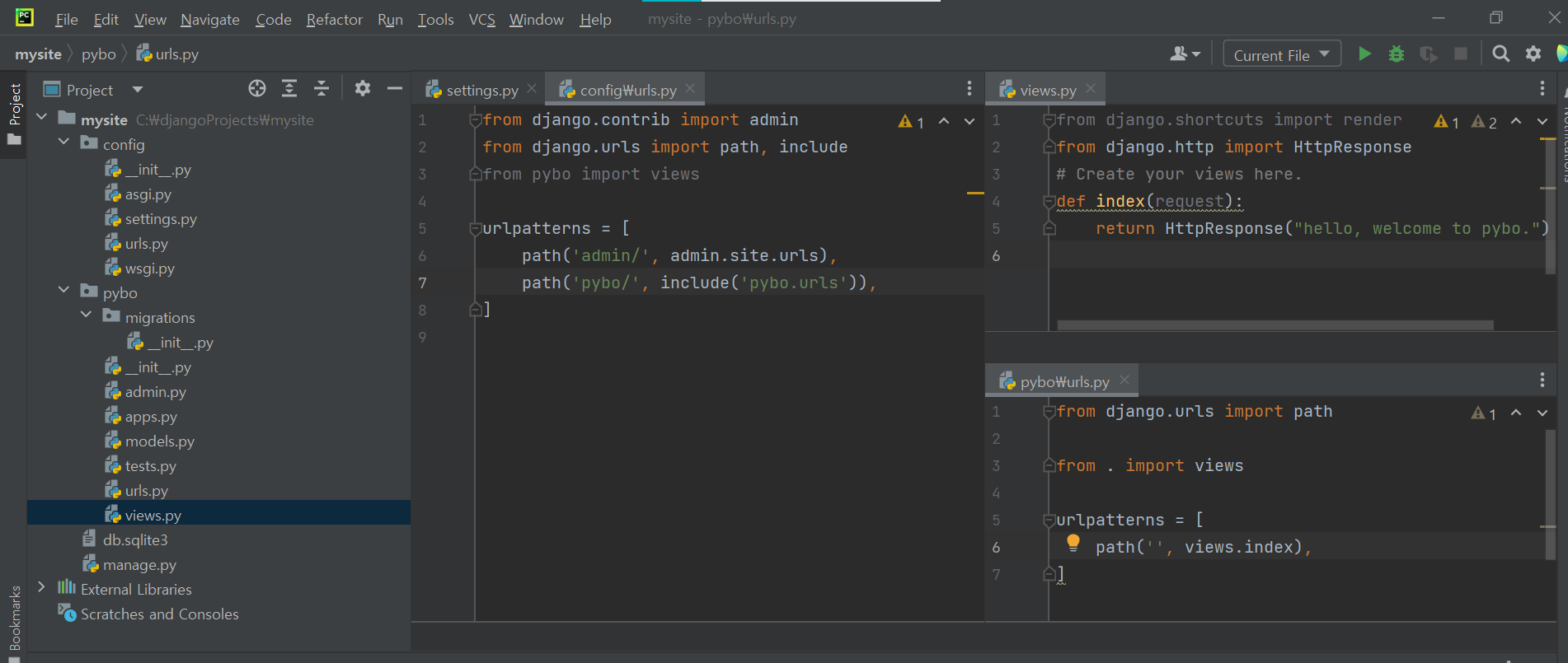 url을 분리하였다. 처음에 config\urls.py에서 line7에서 include('pybo.urls')로 변경하여 파이보 디렉토리의 urls파일에서 url을 찾으라고 한다. 그러면 pybo디렉토리의 urls파일에 가면 url패턴에서 빈 문자열''을 받았으니  views의 파일에서 index함수를 작동시켰다.