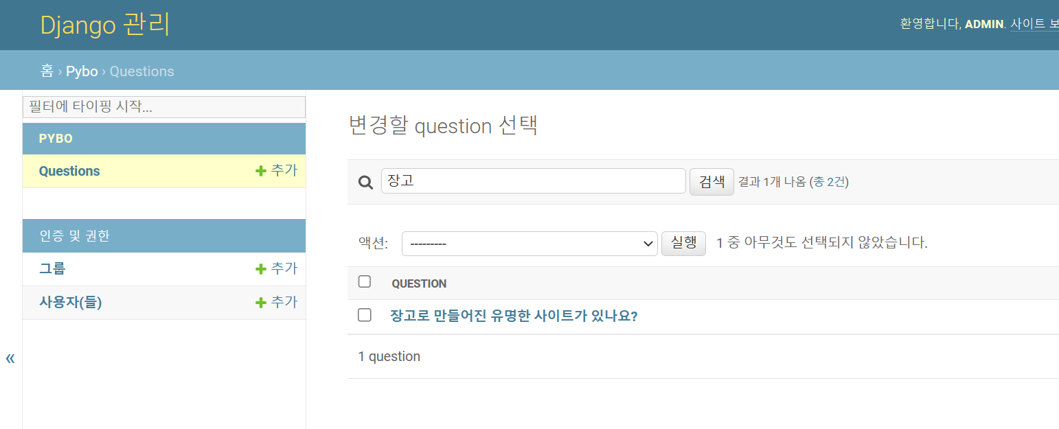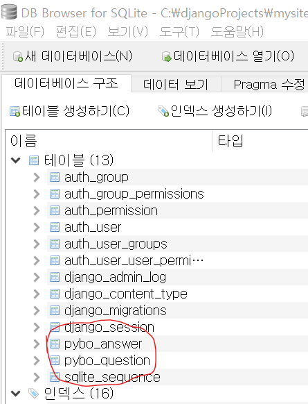 각각 속성들은 차례로 질문의 제목,질문의 내용,질문을 작성한 일시를 뜻한다.각각 속성들은 차례로 질문,답변 내용,답변을 작성한 일시를 뜻한다. line10의 on_delete=models.CASCADE는 답변에 연결된 질문이 삭제되면 답변도 같이 삭제하라는 의미다.위에서 만들 모델을 config/settings.py에 추가모델 생성 및 변경 후 migrate명령어를 수행하기 위한 작업migrate실행후 SQLite에서 테이블이 생성되었음을 볼 수 있다.python manage.py shell로 장고 셸을 실행하여 Question모델로 질문 데이터 생성. 위와 같이 조회되면 보기 불편하니 보기 편하게 조작한다.파이보 디렉토리의 모델스.파이 파일에 다음 클래스안에 다음 함수를 넣는다.다시 조회해보았다.filter는 여러건의 데이터 반환, get함수는 단 하나의 데이터만.