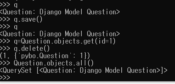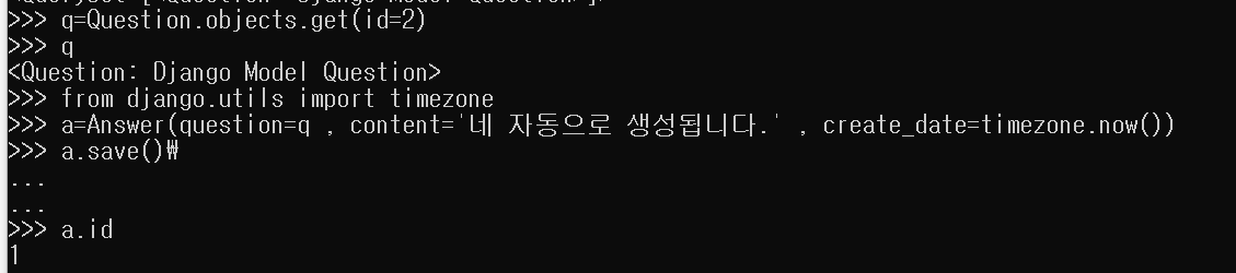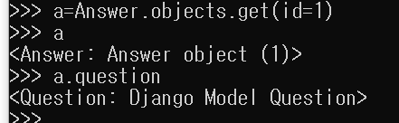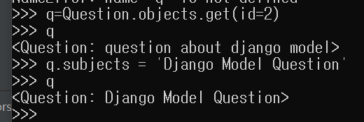 제목 일부를 이용해서 조회subjects의 속성 수정하기.수정한 것을 저장한 뒤에 id=1인 질문을 삭제하고 삭제가 잘 되었는지 확인.Answer모델을 생성하며 이 모델도 id가 있다.질문과 답변이 연결되어 있음을 확인.