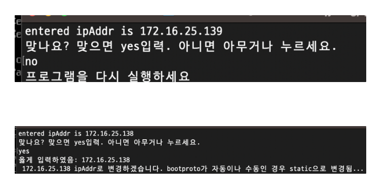 echo " ${1} ipAddr로 변경하겠습니다. bootproto가 자동이나 수동인 경우 static으로 변경됨..."
