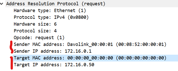 아래는 request패킷이다. target mac address는 해당 목적지의 mac주소를 기록하는데 모르는 경우 1로 채워서 보낸다.