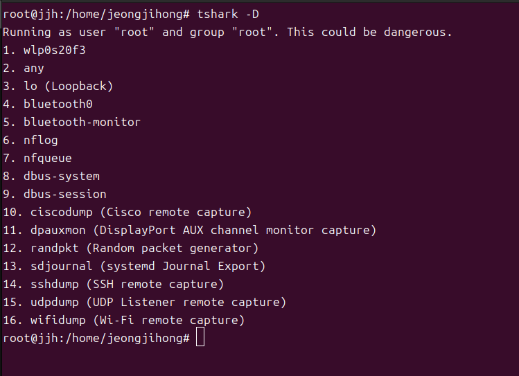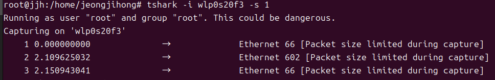 - wlp0s20f3:시스템에서 Wi-Fi 네트워크 인터페이스를 나타내며, 일반적으로 무선 네트워크 카드와 연결된 인터페이스이다. 이를 통해서 무선 네트워크에서 패킷을 캡처할 수 있다.