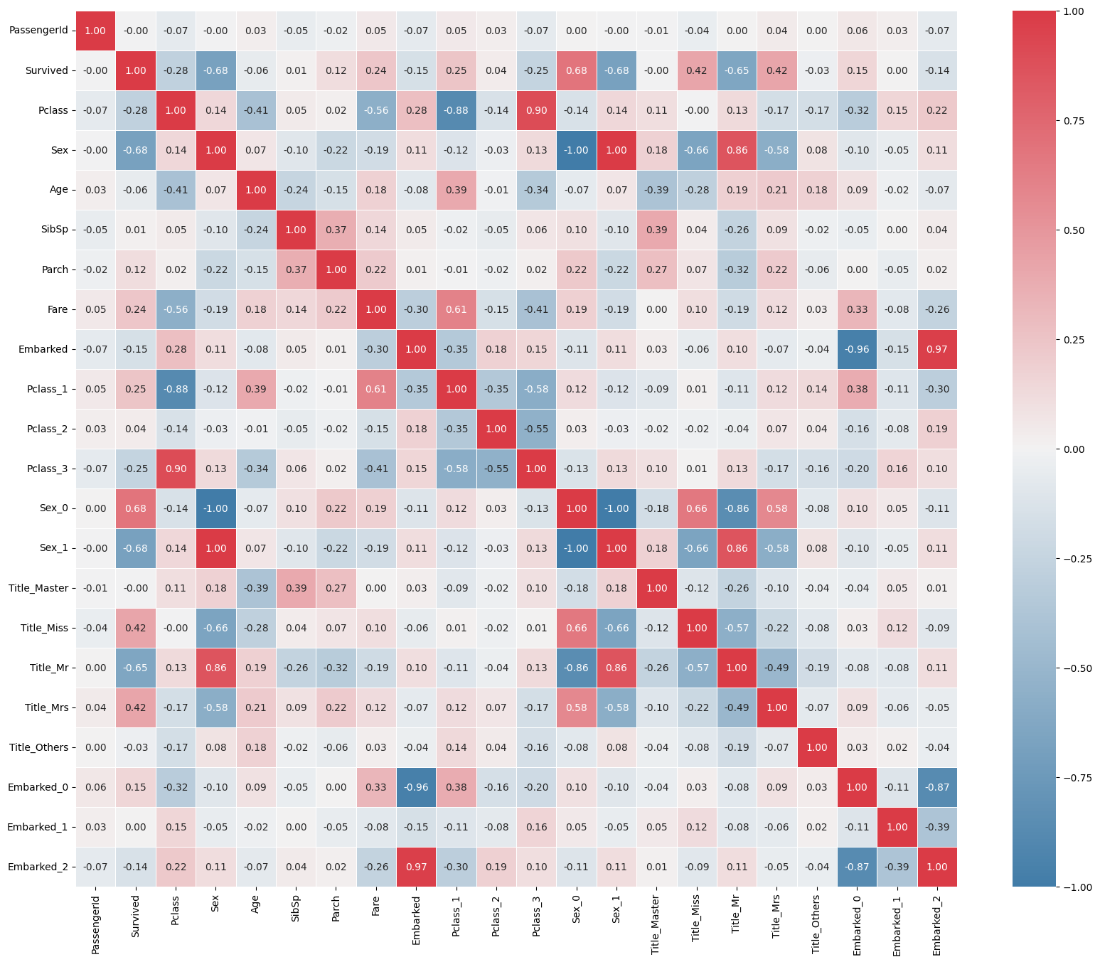 sns.heatmap(df_titanic.corr(), annot=True, cmap = cmap, linewidths=.5, fmt = '.2f', annot_kws={"size":10})