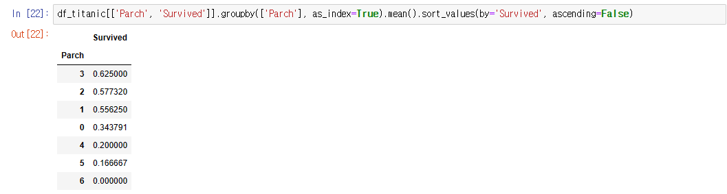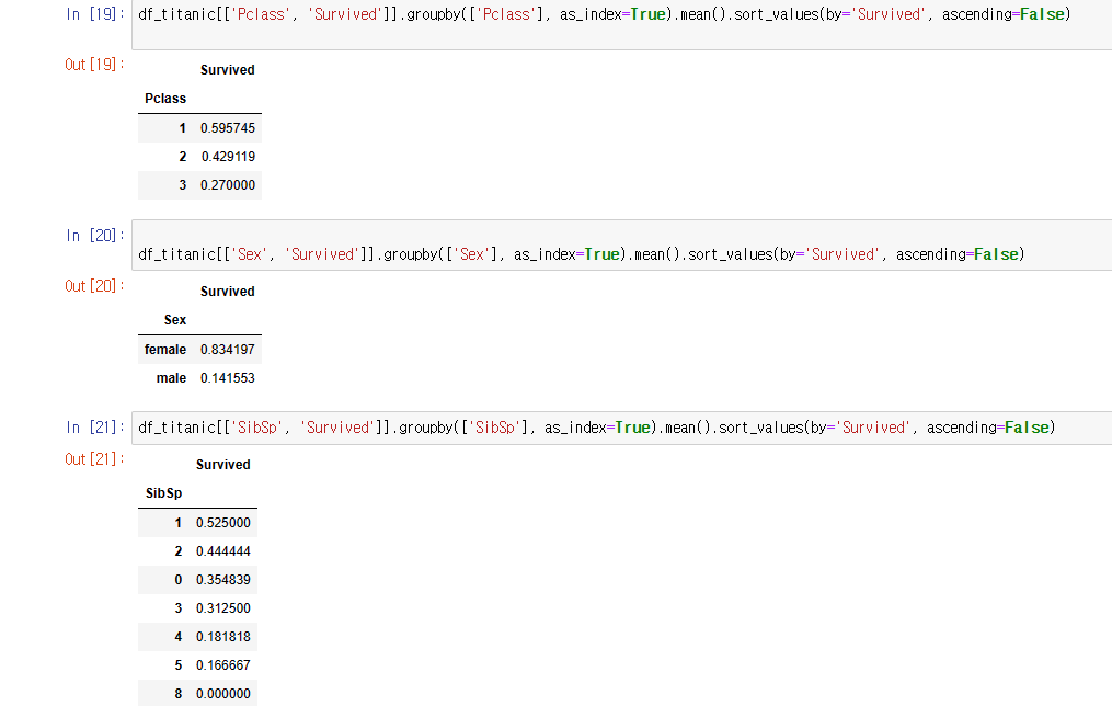 print("아래 표들을 통하여 좌석등급이 높을 수록, 성별은 여성, sibsp수는 1명 , 부모와 자식수는 3인경우가 생존율이 높았다")