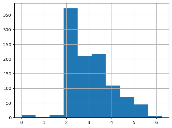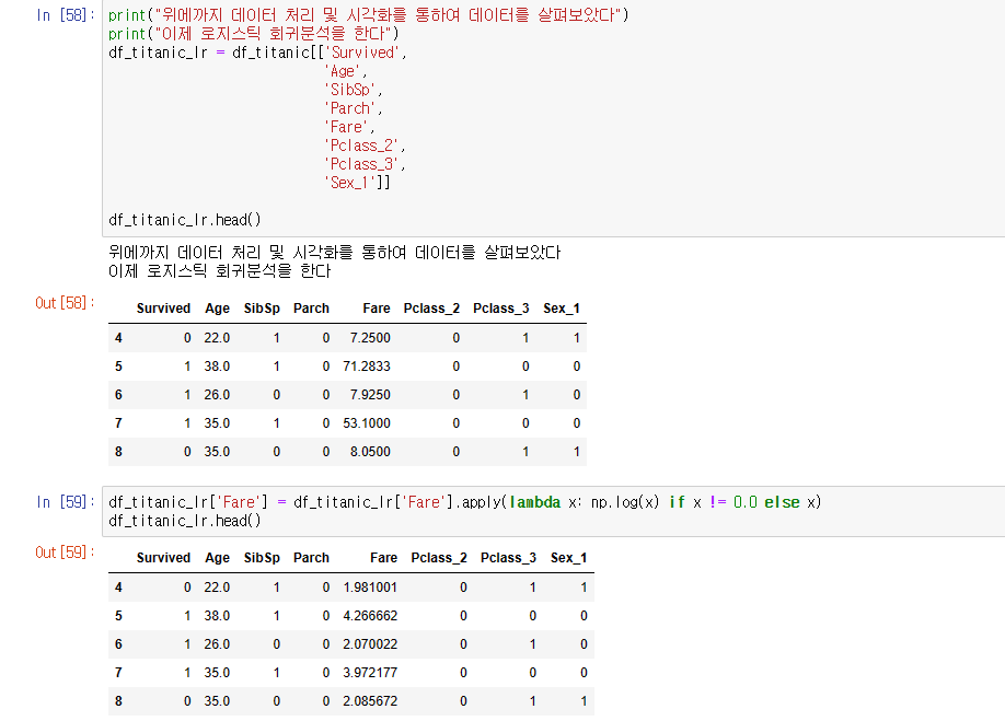 print("Fare값은 로지스틱 분석 전에 자연로그값을 이용하여 고르게 분포하도록 작업한다")