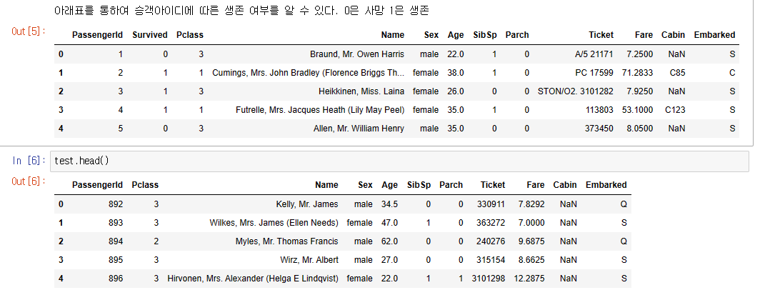 print("아래표를 통하여 승객아이디에 따른 생존 여부를 알 수 있다. 0은 사망 1은 생존")