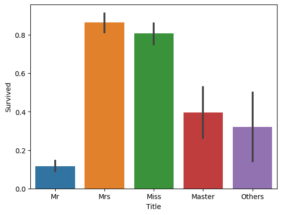 sns.barplot(x='Title', y='Survived', data=df_titanic)