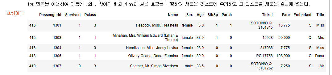 print("for 반복을 이용하여 이름에 ,와 . 사이의 Mr과 Miss과 같은 호칭을 구별하여 새로운 리스트에 추가하고 그 리스트를 새로운 컬럼에 넣는다.")