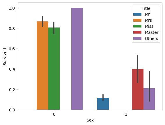 sns.barplot(x='Sex',y='Survived', hue='Title', data=df_titanic)
