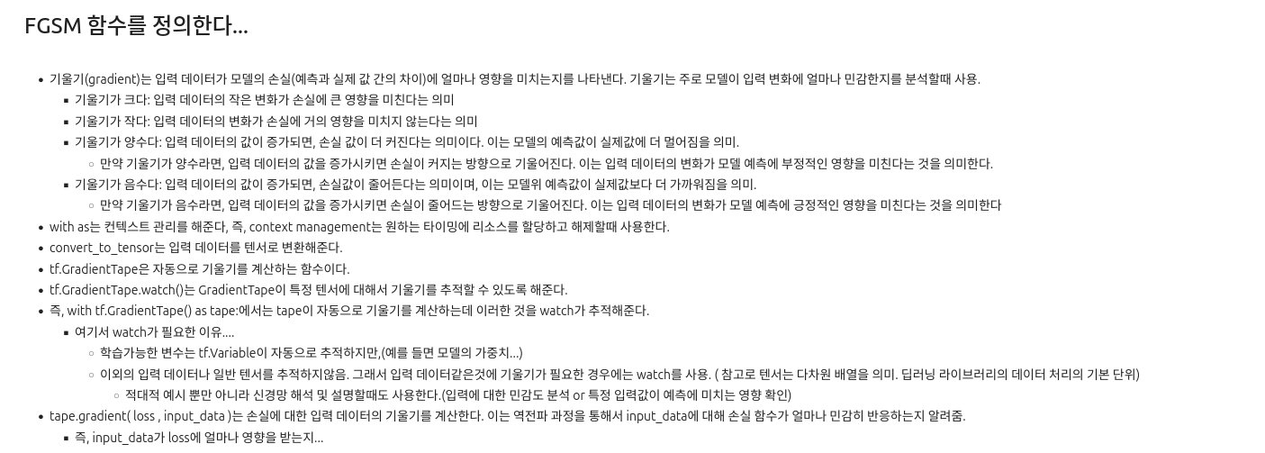 - tape.gradient( loss , input_data )는 손실에 대한 입력 데이터의 기울기를 계산한다. 이는 역전파 과정을 통해서 input_data에 대해 손실 함수가 얼마나 민감히 반응하는지 알려줌.