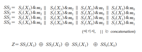 - 입력의 각 바이트를 비션형 변환 후, 그 결과 32비트를 4비트 왼쪽 회전 이동 후 출력