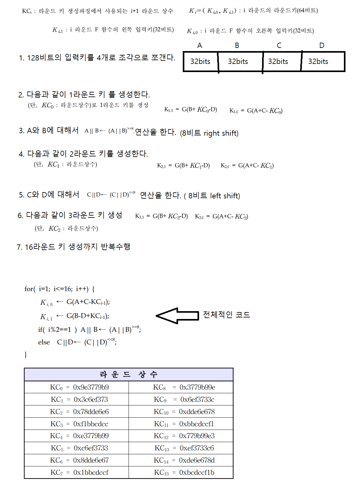 - ===> SEED의 키 생성 알고리즘은 제한된 환경에서의 효율성을 위해서, 암호화나 복호화시 라운드 키를 간단히 계산할 수 있게 설계함.