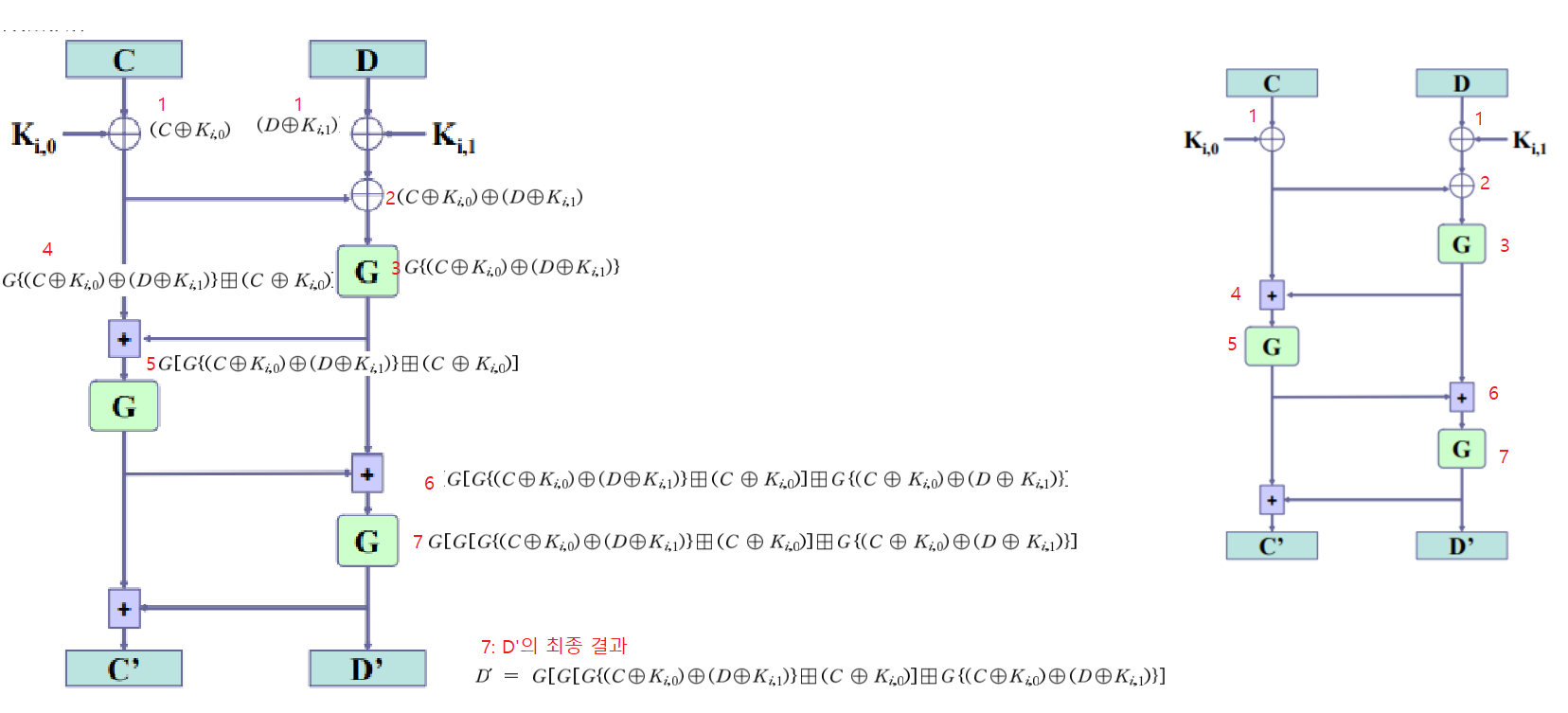 - 즉, 64비트( C , D ) 와 64비트 키 Ki( =( K[i,0] , K[i,1] ) ) 를 입력으로 받음.