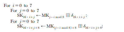 SubKey[16*i+j] = MasterKey[ j-i mod 8 ] ⊞ delta[16*i+j+8]
