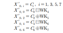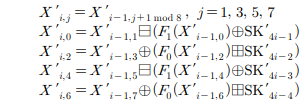X[i][0] = X[i-1][7] xor ( F0( X[i-1][6] ) ⊞ SK[4*i-1] )