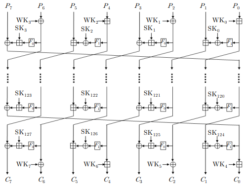 X[i][4] = X[i-1][3] xor ( F0( X[i-1][2] ) ⊞ SK[4*i-3] )
