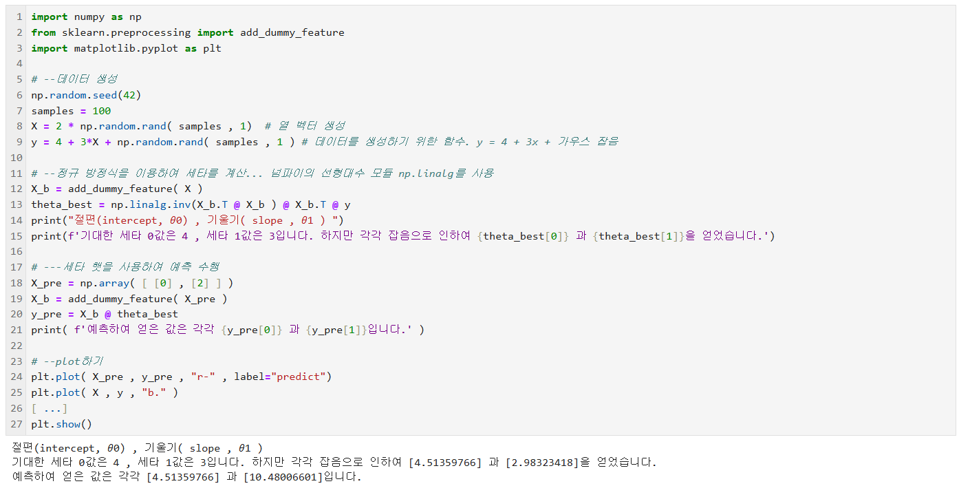 # --정규 방정식을 이용하여 세타를 계산... 넘파이의 선형대수 모듈 np.linalg를 사용