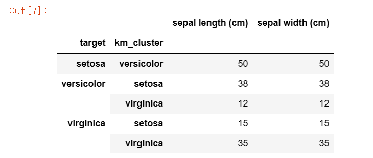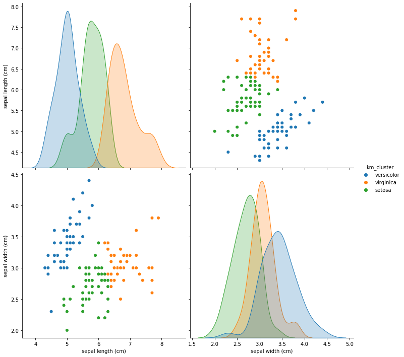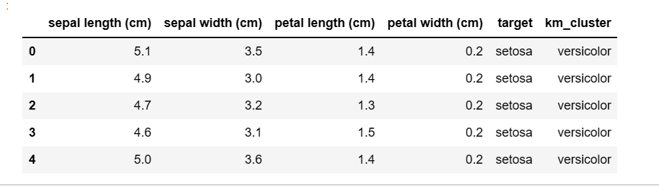 df_iris['km_cluster'] = df_iris['km_cluster'].apply(lambda x: 'setosa' if 0 == x else ('versicolor' if 1 == x else 'virginica'))
