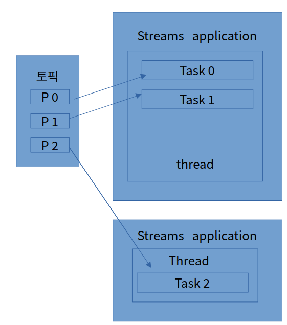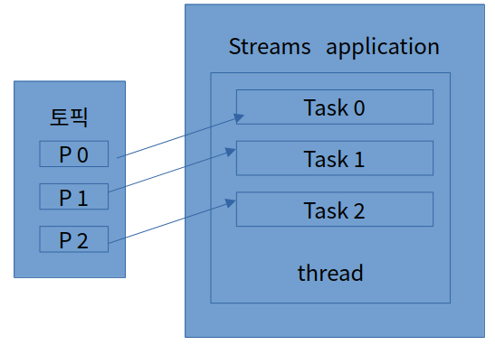 - 만약 3개의 partition으로 이루어진 topic을 처리하는 stream application을 실행하면, 내부에 3개의 task가 생김