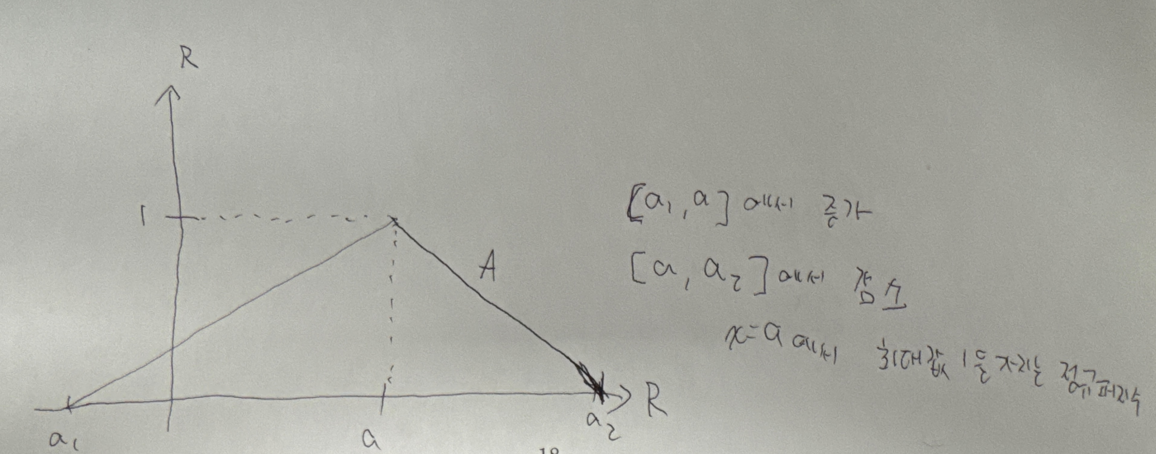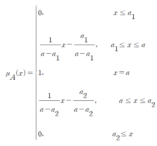 - 퍼지수 A의 소속 정도 함수 µA : R -> [ 0,1 ] 이 아래와 같을때, 이러한 퍼지수 A를 삼각형 퍼지수라고 함