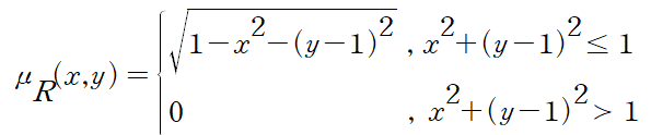 - 실수들의 곱집합 RxR에서 정의된 퍼지 관계R의 소속정도 함수이다.