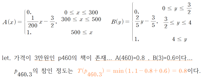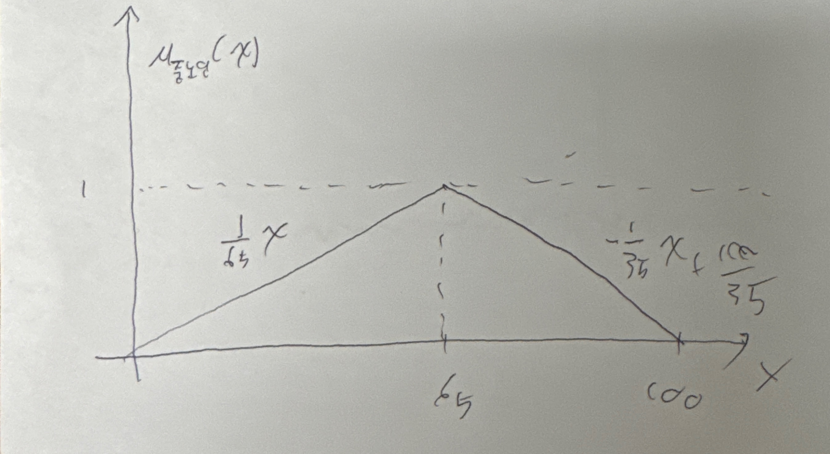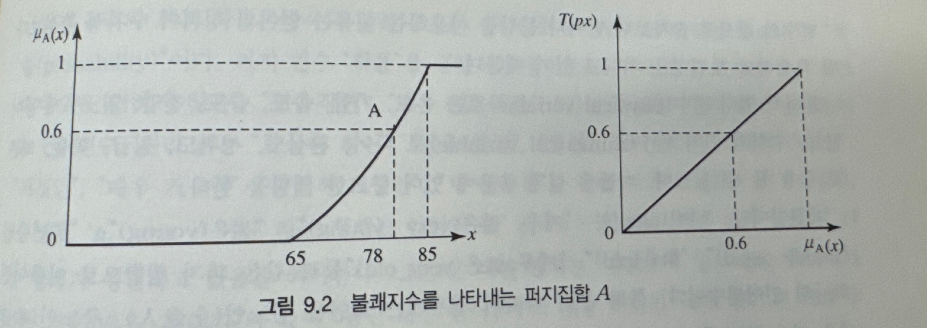 - X를 특정 지역에서의 불쾌 지수라고 하자. '불쾌 지수가 높은'에 대한 퍼지 집합 A의 소속정도 함수는 위의 왼쪽과 같다.