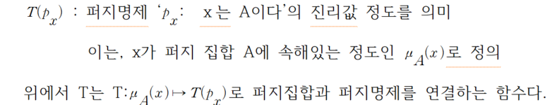 그러면 소속정도 함수는 퍼지명제 'px : x는 A이다'의 함인 정도 T(px)를 얻는다.- 위에서 T함수는 [0,1]에서 [0,1]로 가는 함수이며, 퍼지 집합과 퍼지 명제 사이를 연결한다.