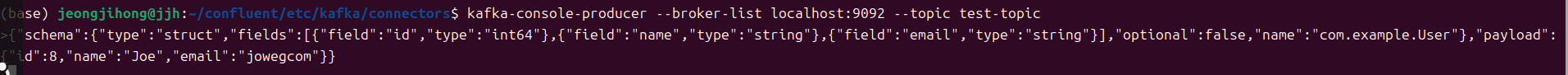 {"schema":{"type":"struct","fields":[{"field":"id","type":"int64"},{"field":"name","type":"string"},{"field":"email","type":"string"}],"optional":false,"name":"com.example.User"},"payload":{"id":8,"name":"Joe","email":"jowegcom"}}