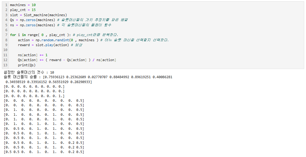 self.ns = np.zeros(machines) # 각 슬롯 머신의 플레이 횟수를 0으로 초기화