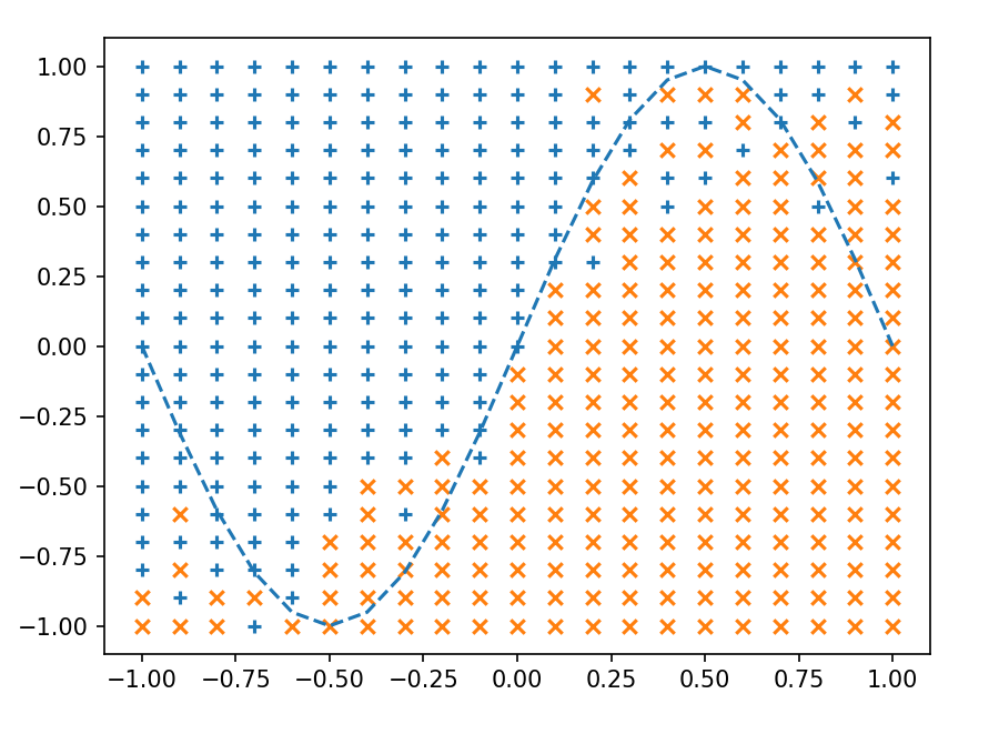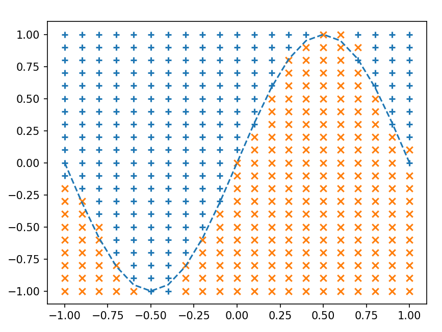 if Y < np . sin ( np . pi * X ): #sin값이 아래에 존재시에 0,1을 넣는다(원핫 인코딩)