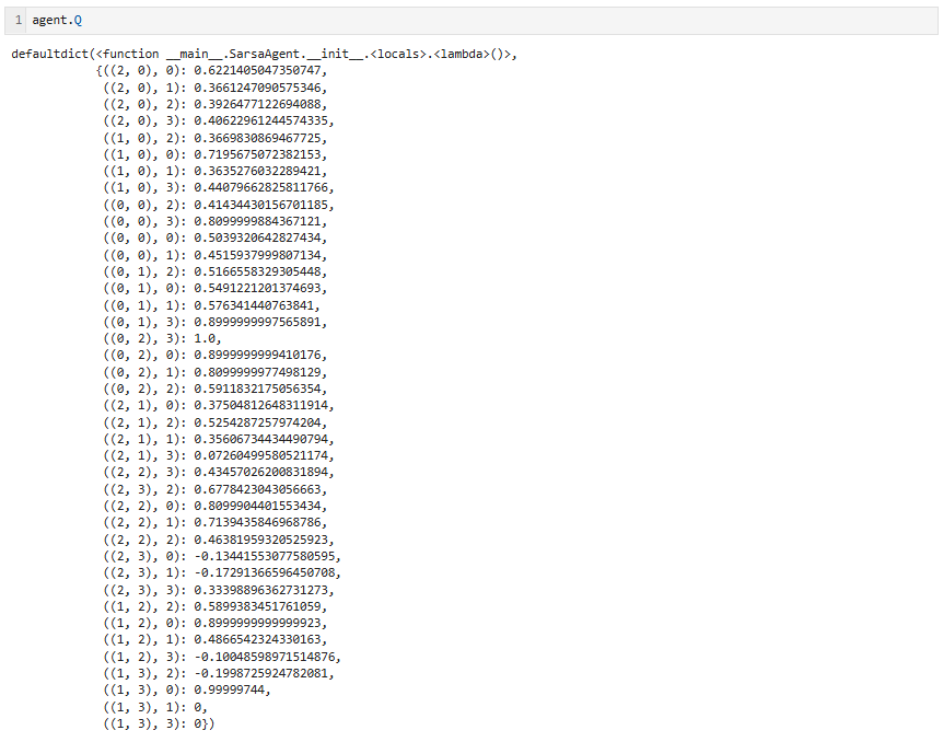 target = reward + self.gamma * next_q # next_q는 defaultdict타입이니 value값에만 gamma가 곱해짐. key의 형태는 (state ,actiom)형태이며, 해당값에 대한 value는 Q함수 값이다.