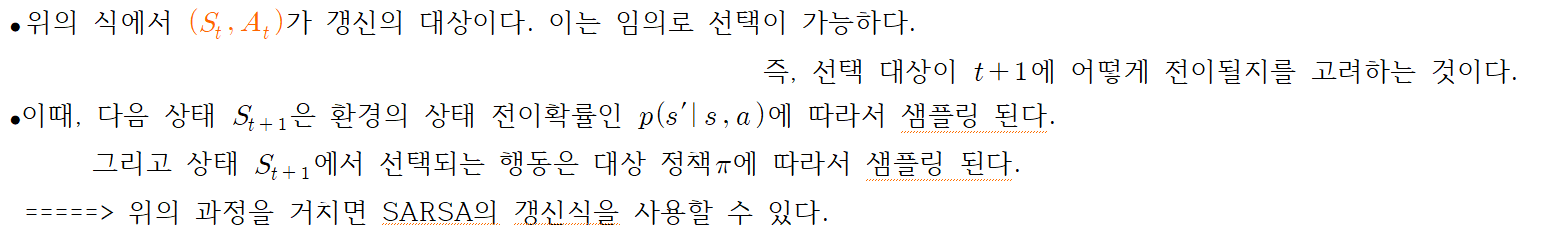 - 대표적인 on-policy TD학습 알고리즘이다.( on-policy는 '대상 정책' == '행동 정책'이다. 서로다른 경우는 off policy다.)