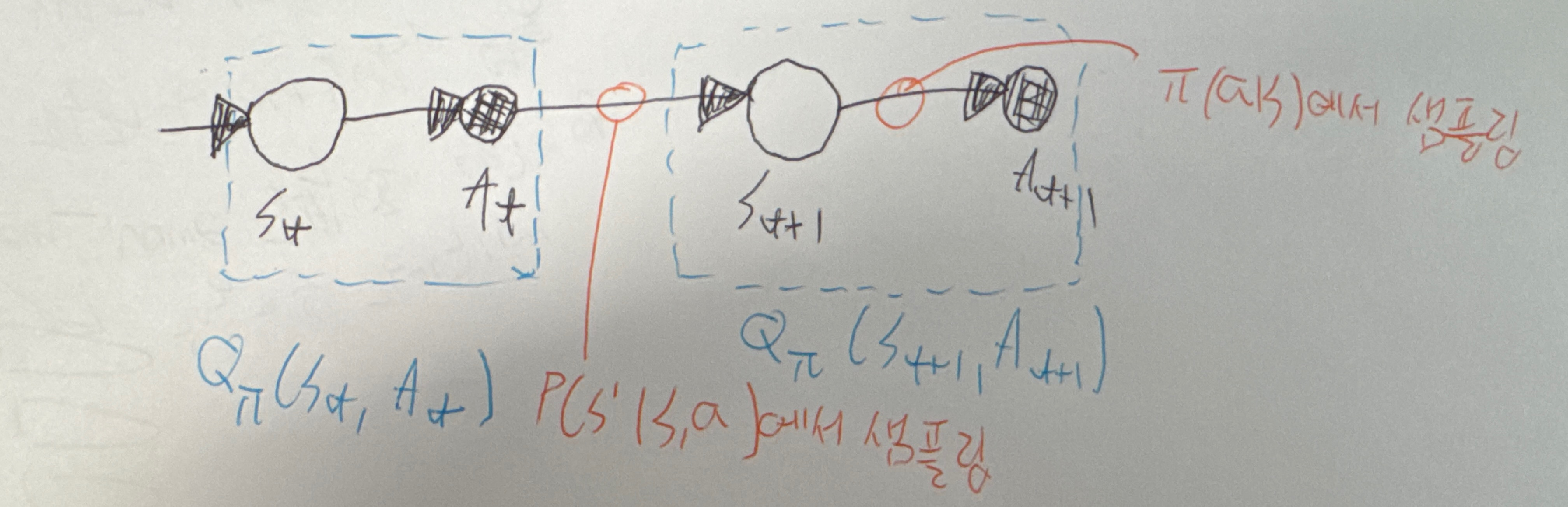 - 위의 백업 다이어그램을 보면 알수있듯이, SARSA는 벨만 방정식의 샘플링 버전으로 볼 수있다.