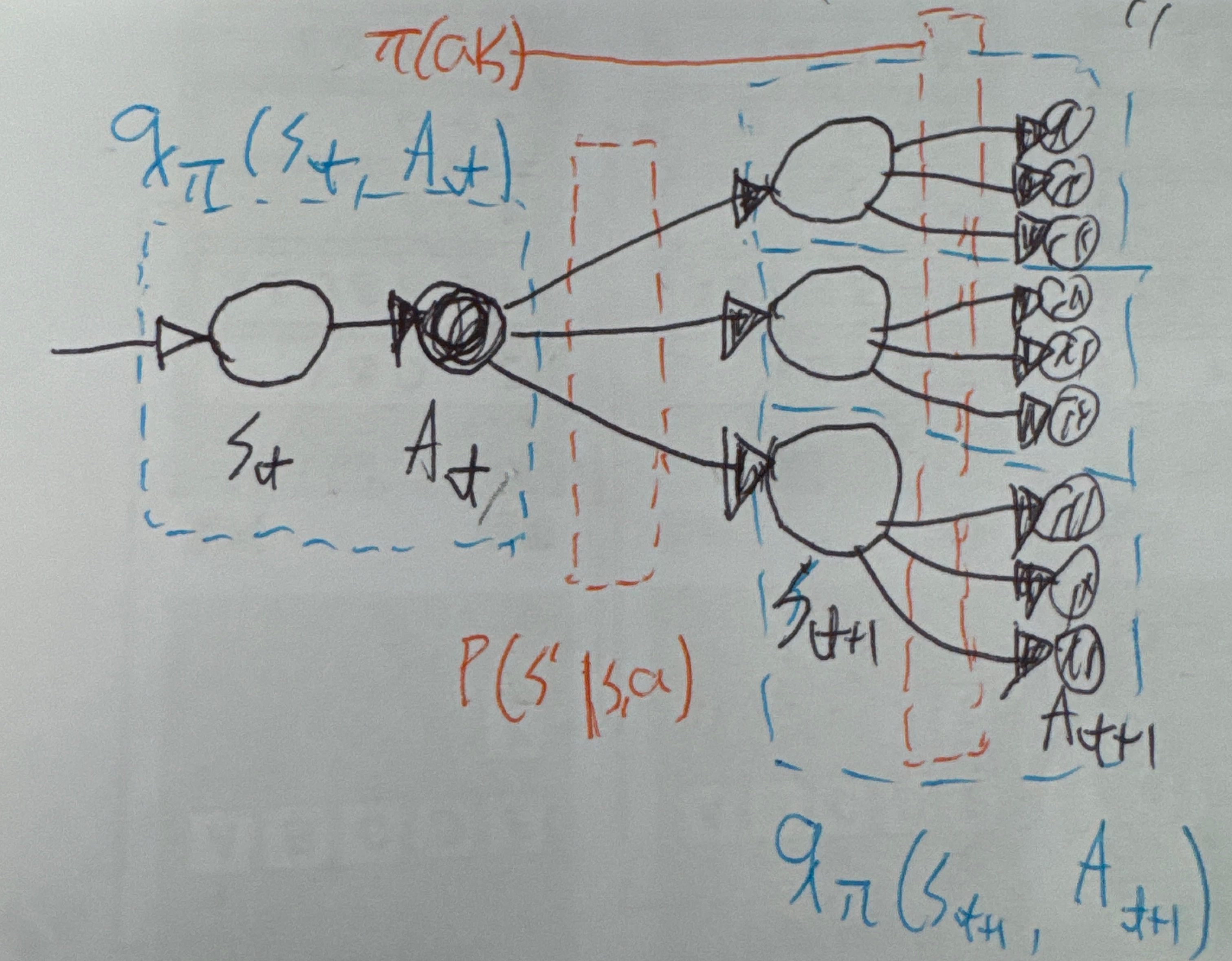 - 에이전트의 정책pi에 따른 다음 단계의 모든 행동을 고려함.
