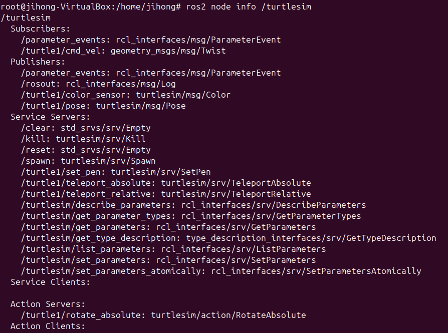 그리고, ros node info를 이용하여, 특정한 노드에 대한 정보를 조회하였다.- 이 tool은 complex한 현실세계의 로봇 시스템의 flow of data 이해하기 위해서 필수적이다.