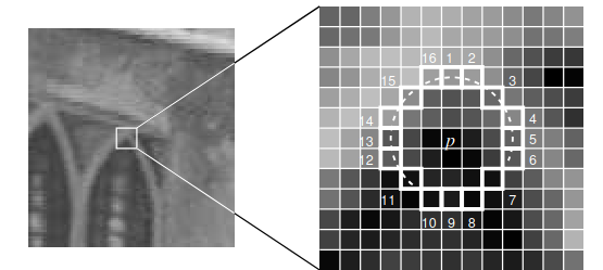 - 중심 픽셀 p의 밝기 값과 16개의 원형 이웃 픽셀의 밝기 값을 비교한다.