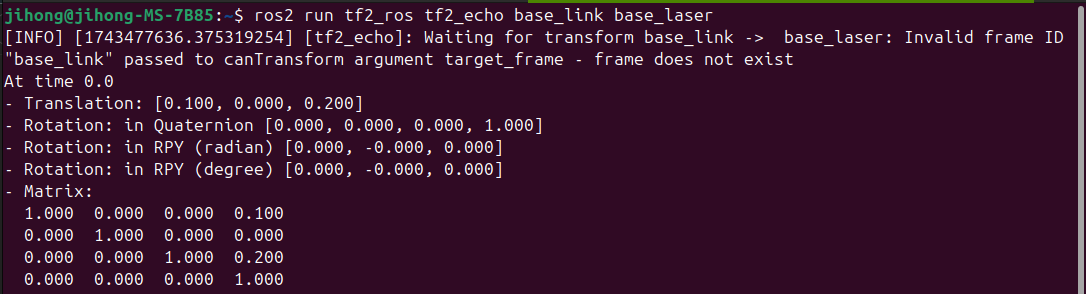 - 이는 base_link에서 base_laser로 이동하기 위해서, " x: 0.1m , y: 0.0m , z: 0.2m "의 평행이동이 필요함을 의미한다.